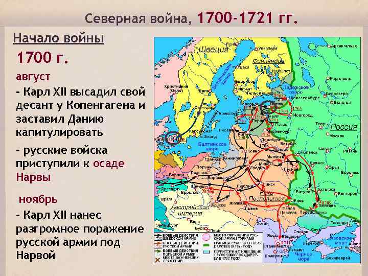 Северная война, 1700 -1721 гг. Начало войны 1700 г. август - Карл XII высадил свой десант у Копенгагена и заставил Данию капитулировать - русские войска приступили к осаде Нарвы ноябрь - Карл XII нанес разгромное поражение русской армии под Нарвой