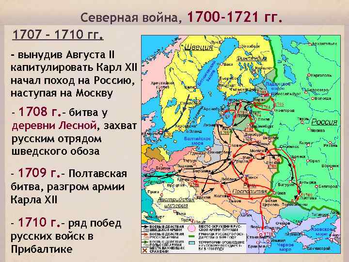 Северная война, 1700 -1721 гг. 1707 – 1710 гг. - вынудив Августа II капитулировать Карл XII начал поход на Россию, наступая на Москву - 1708 г. – битва у деревни Лесной, захват русским отрядом шведского обоза - 1709 г. – Полтавская битва, разгром армии Карла XII - 1710 г. – ряд побед русских войск в Прибалтике