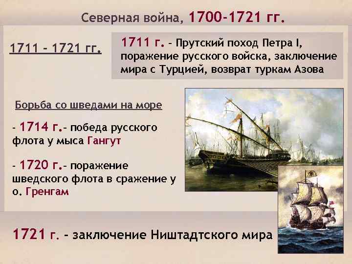 Северная война, 1700 -1721 гг. 1711 – 1721 гг. 1711 г. – Прутский поход Петра I, поражение русского войска, заключение мира с Турцией, возврат туркам Азова Борьба со шведами на море - 1714 г. – победа русского флота у мыса Гангут - 1720 г. – поражение шведского флота в сражение у о. Гренгам 1721 г. – заключение Ништадтского мира