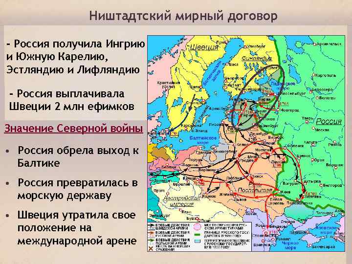 Ништадтский мирный договор - Россия получила Ингрию и Южную Карелию, Эстляндию и Лифляндию - Россия выплачивала Швеции 2 млн ефимков Значение Северной войны • Россия обрела выход к Балтике • Россия превратилась в морскую державу • Швеция утратила свое положение на международной арене