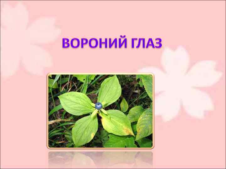 Это многолетнее невысокое растение легко узнать — оно не похоже ни на какое другое. В верхней части стебля (высота его — 15— 30 см) расположена четырехлистная мутовка, из которой выходит цветоножка с зеленоватым цветком. Ягода вороньего глаза черная, с синеватым налетом.