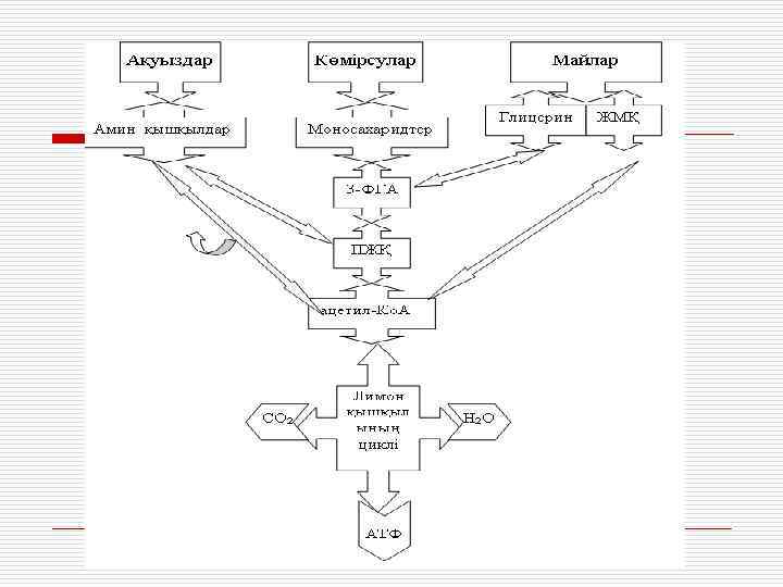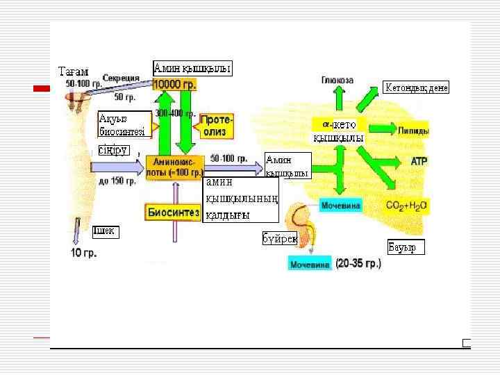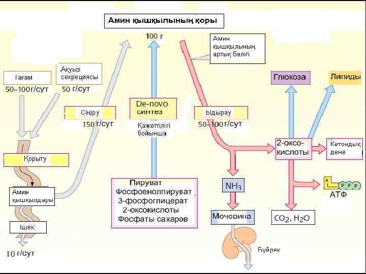 Катаболизм Амин қышқылдары Декарбоксилдену (гис, тир, глу) Қайта аминдену (дезаминдену) Мочевина синтезі α-кето қышқылы + NH 3 Тотықсыздана декарбоксилдену Аминдер + СО 2 Аммоний тұздары Амидтер синтезі (глн, асн) Май қышқылдары β- тотығу Ацетил-Ко. А + О 2 Иминдер + Н 2 О 2 + Н 2 О Альдегид + NH 3 Тотығу