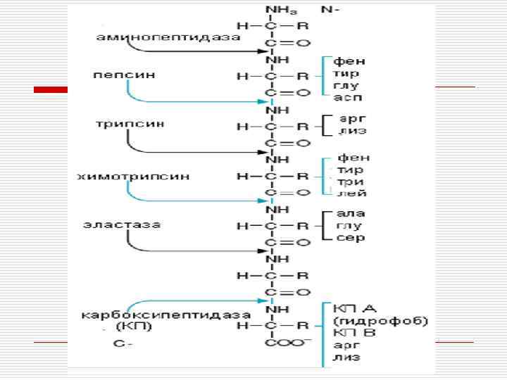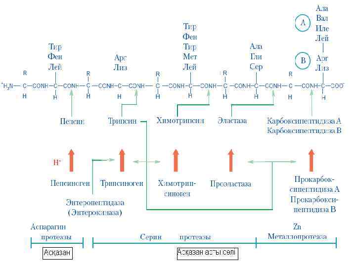 Асқазаннан (ұлтабардан) азықтық массалар порцияланып он екі елі ішекке түседі; o Қалған бөліктері жіңішке ішекке өтеді де гидролиздену аяқталады. o Негізгі ферменттері: - Трипсин, трипсиннің белсендірілмеген бөлігі трипсиноген деп аталады. Активаторы энтерокиназа ферменті. - Трипсин басқа фермент химотрипсиногенді химотрипсинге өзгертеді. - Ақуызды аминопептидаза және карбоксипептидаза ферменттері гидролиздеп бос амин қышқылдарына айналдырады. o