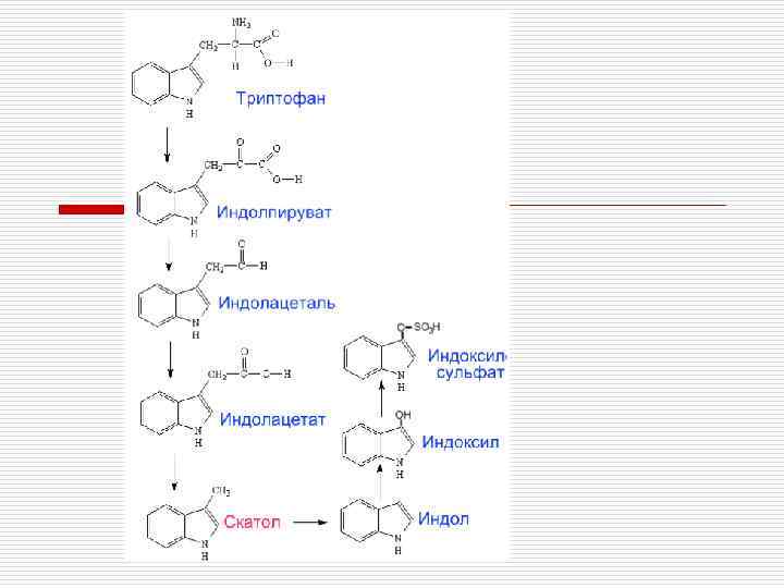 Микроағзалардың әсерінен АҚ: o Декарбоксилденуден биогенді аминдер: диамин: лизиннен- кадаверин, орнитинненпутресцин моноамин: тирозиннен - тирамин, гистидинненгистамин o Дезаминдену аммиактың түзілуі. Осы декарбоксилаза, дезаминаза және басқа бактерия ферменттерінің әсерінен ароматты амин қышқылдарының бүйір тізбектері біртіндеп қысқарады. o Амин қышқылдарының циклді бөлігі гидрофобты қасиетке ие бола отырып сіңірілгеннен кейін бауыр жасушасына уландырғыш әсер етеді.