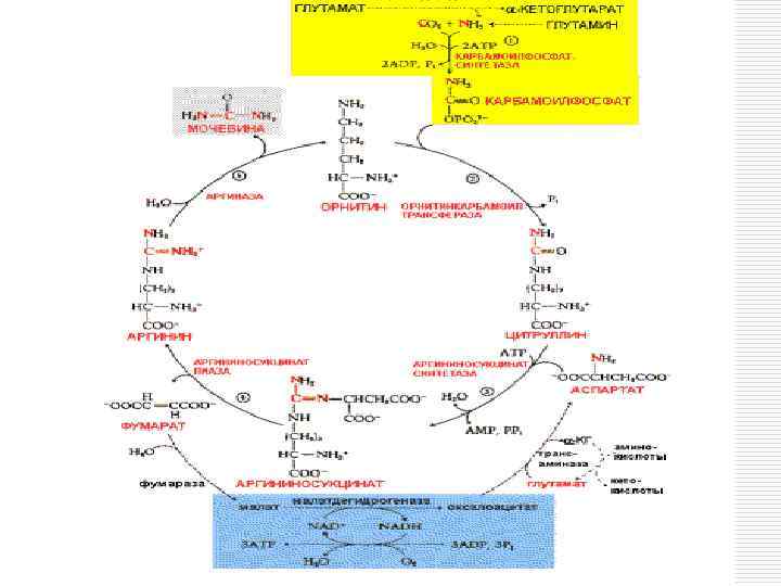 o o o I-ші сатыда аммиак көмір қышқыл газы мен АТФ-тің ыдырауынан түзілген энергия негізінде карбамилфосфат, ал ол өз кезегінде орнитинмен (табиғи емес амин қышқылы) әрекеттесіп цитруллин түзеді. II –ші сатыда аммиактың тағы бір молекуласы αкетоглутар қышқылымен тотықсыздана аминдену арқылы глютамин қышқылын түзеді. Ал глютамин қышқылы таңбаланған аммиак молекуласын NH 2 түрінде қымыздық сірке қышқылына береді, ол реакция негізінде аспарагин қышқылына (қайта аминдену реакциясы) айналады. III-ші сатыда мочевинаның синтезі жүреді. Цитруллин және аспарагин қышқылы АТФ энергиясының қатысында аргинин-янтарь қышқылын түзеді, ол одан әрі фумар қышқылы мен аргининге ыдырайды. Аргинин аргиназа ферментінің әсерінен орнитин мен мочевинаға ыдырайды. Орнитин қайтадан I –ші сатыға кірігуі мүмкін, ал түзілген мочевина бүйректің көмегімен ағзадан сыртқа шығарылады.
