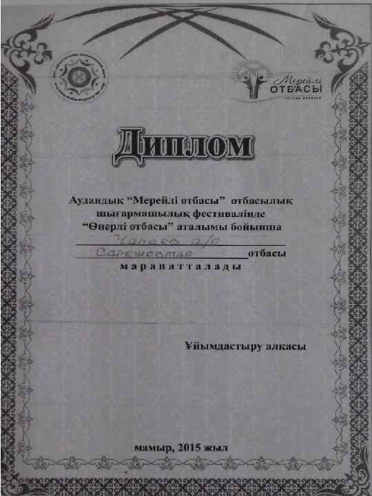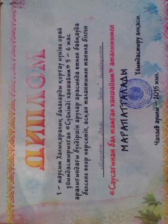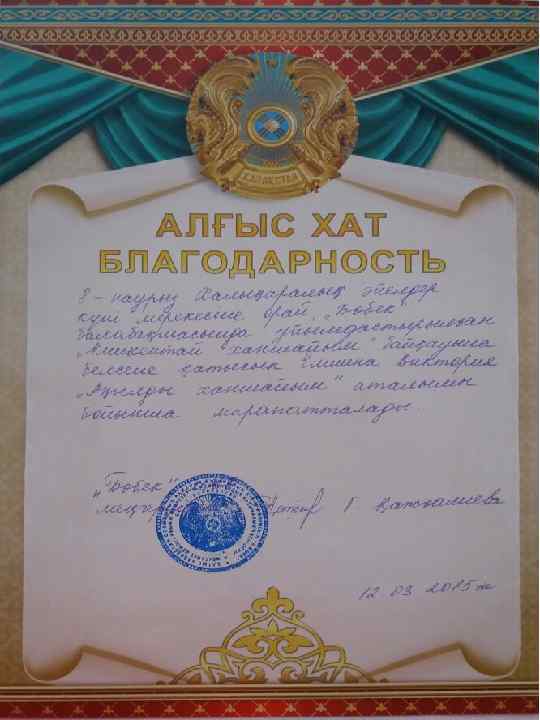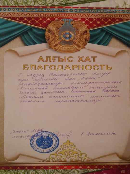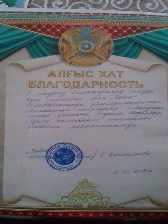 Қазақстан Республикасының 25 – жылдығына орай ұйымдастырылған «Тәуелсіздікке 25 жыл» атты мерекелік шараға белсене қатысқан болатынмын және аталған мейрамға байланысты аудан орталығының басшысы М. А. Зиналиев пен МДҰ меңгерушісі Г. Ж. Кажгалиеваның Мадақтама грамоталарына ие болдым!