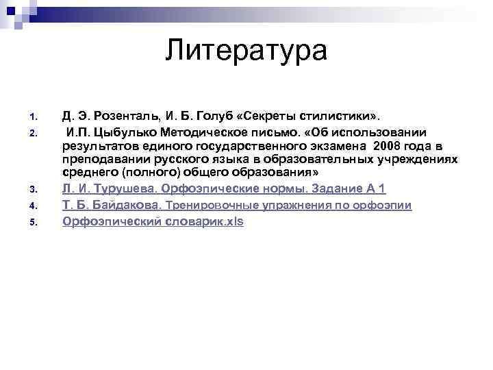 Литература 1. Д. Э. Розенталь, И. Б. Голуб «Секреты стилистики» . 2. И. П. Цыбулько Методическое письмо. «Об использовании результатов единого государственного экзамена 2008 года в преподавании русского языка в образовательных учреждениях среднего (полного) общего образования» 3. Л. И. Турушева. Орфоэпические нормы. Задание А 1 4. Т. Б. Байдакова. Тренировочные упражнения по орфоэпии 5. Орфоэпический словарик. xls