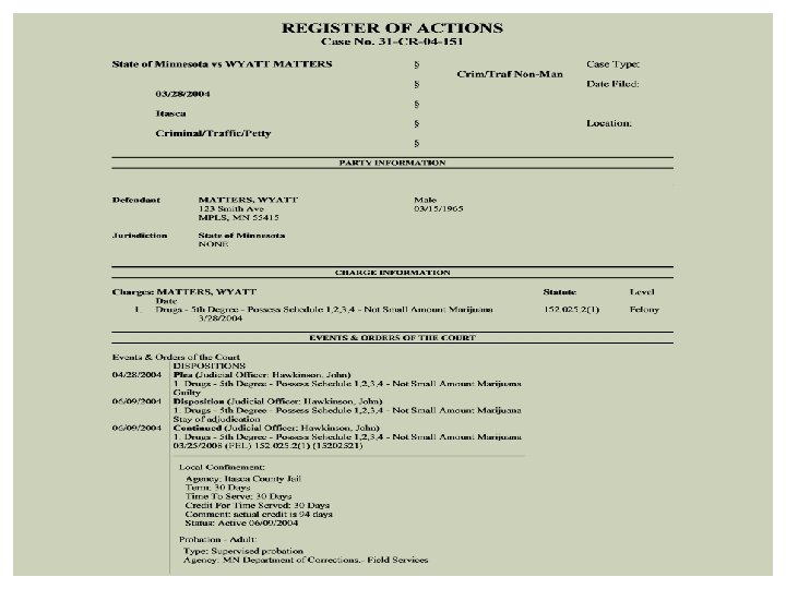 WHERE RECORDS ARE KEPT Bureau of Criminal Apprehension (BCA) Minnesota Court Information System (MNCIS) Police Department City Attorney Sheriff’s Department County Attorney State Attorney General Department of Corrections Department of Human Services Private data-miners Private theft databases