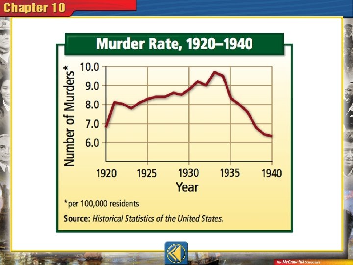 A Clash of Cultures (cont. ) – John T. Scopes was found guilty and fined $100. – The conviction was later overturned on a technicality. • People supported the prohibition of alcohol sales for many reasons—some for religious reasons; others thought it would reduce unemployment, domestic violence, and poverty. Murder Rate, 1920– 1940