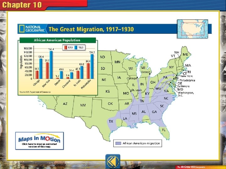 A Changing Society Changes for African Americans • Harlem Renaissance begins. • Literature reveals racial pride and contempt of racism. • Jazz and blues are popularized. • Great Migration during the war creates strong African American voting blocs in Northern cities. • First African American from the North is elected to Congress. • NAACP battles segregation and discrimination.