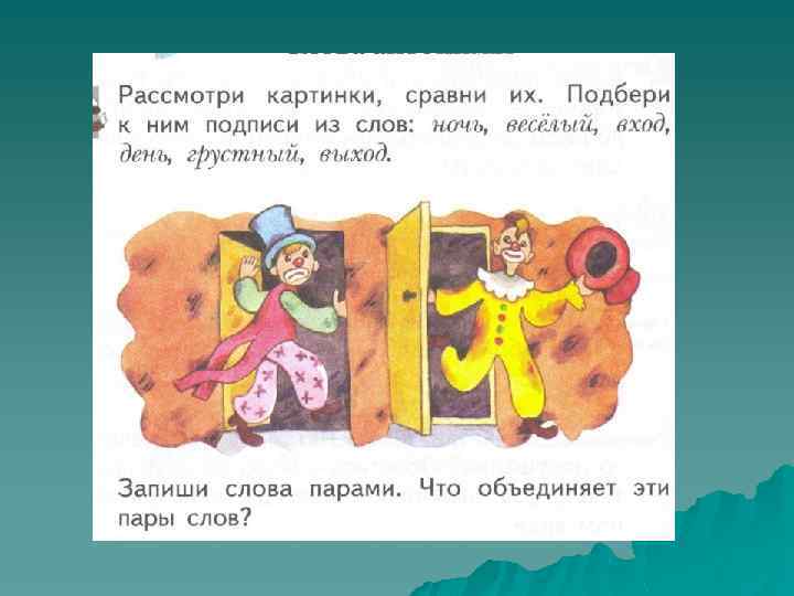Узелки на память n n 1. Антонимы – это слова с противоположным значением. 2. Антонимами могут быть не только слова с разными корнями ( весело- грустно), но и однокоренные слова (весело- невесело, прибегать- убегать) Не все слова имеют антонимы. Их нет, например, у слов: стена, стол, ваза, тетрадь, береза, рука, глаз, корова, карандаш и многих других. Антонимы отвечают на один и тот же вопрос.