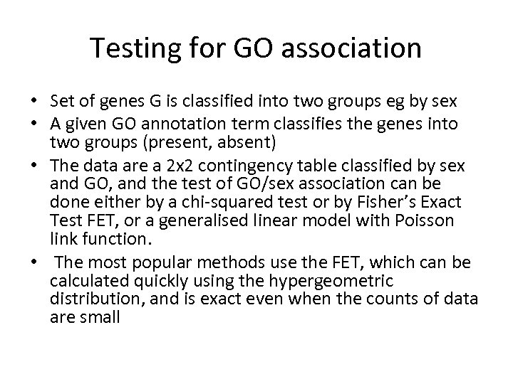 Testing for GO association • Set of genes G is classified into two groups eg by sex • A given GO annotation term classifies the genes into two groups (present, absent) • The data are a 2 x 2 contingency table classified by sex and GO, and the test of GO/sex association can be done either by a chi-squared test or by Fisher’s Exact Test FET, or a generalised linear model with Poisson link function. • The most popular methods use the FET, which can be calculated quickly using the hypergeometric distribution, and is exact even when the counts of data are small