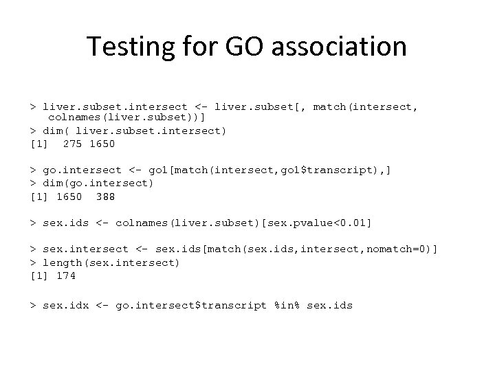 Testing for GO association > liver. subset. intersect <- liver. subset[, match(intersect, colnames(liver. subset))] > dim( liver. subset. intersect) [1] 275 1650 > go. intersect <- go 1[match(intersect, go 1$transcript), ] > dim(go. intersect) [1] 1650 388 > sex. ids <- colnames(liver. subset)[sex. pvalue<0. 01] > sex. intersect <- sex. ids[match(sex. ids, intersect, nomatch=0)] > length(sex. intersect) [1] 174 > sex. idx <- go. intersect$transcript %in% sex. ids