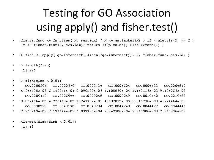Testing for GO Association using apply() and fisher. test() • fisher. func <- function( X, sex. idx) { X <- as. factor(X) ; if ( nlevels(X) == 2 ) {f <- fisher. test(X, sex. idx); return (f$p. value)} else return(1) } • > fish <- apply( go. intersect[, 4: ncol(go. intersect)], 2, fisher. func, sex. idx ) • • > length(fish) [1] 385 • • > fish[fish < 0. 01] GO. 0000267 GO. 0002376 GO. 0003735 GO. 0005624 GO. 0005783 GO. 0005840 5. 255498 e-03 6. 142841 e-04 9. 096193 e-03 4. 108839 e-04 1. 153113 e-03 9. 125263 e-03 GO. 0006412 GO. 0006955 GO. 0009058 GO. 0009059 GO. 0016740 GO. 0016788 9. 852476 e-05 4. 726468 e-05 7. 243732 e-03 4. 532035 e-05 3. 915276 e-03 4. 224464 e-03 GO. 0030529 GO. 0043170 GO. 0043234 GO. 0044249 GO. 0044422 GO. 0044446 2. 250219 e-03 2. 157644 e-03 5. 039780 e-04 2. 347306 e-04 2. 360906 e-03 • •