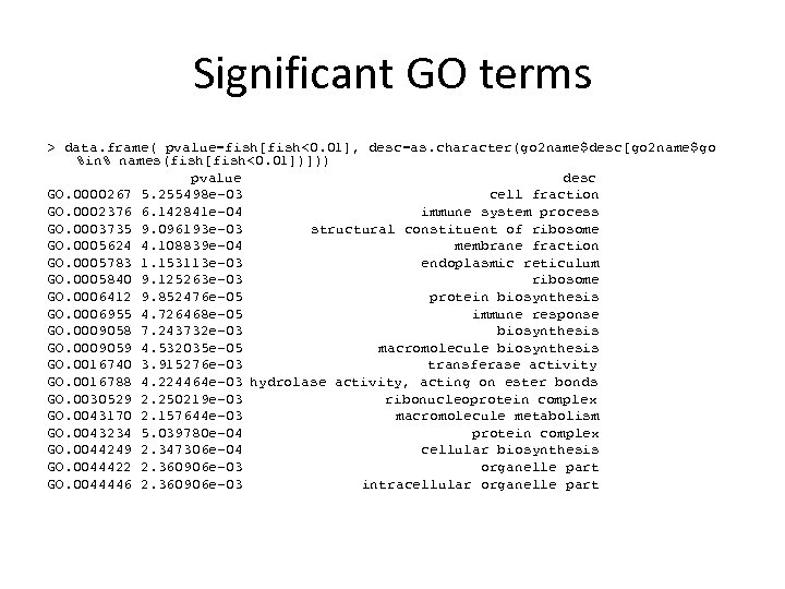 Significant GO terms > data. frame( pvalue=fish[fish<0. 01], desc=as. character(go 2 name$desc[go 2 name$go %in% names(fish[fish<0. 01])])) pvalue desc GO. 0000267 5. 255498 e-03 cell fraction GO. 0002376 6. 142841 e-04 immune system process GO. 0003735 9. 096193 e-03 structural constituent of ribosome GO. 0005624 4. 108839 e-04 membrane fraction GO. 0005783 1. 153113 e-03 endoplasmic reticulum GO. 0005840 9. 125263 e-03 ribosome GO. 0006412 9. 852476 e-05 protein biosynthesis GO. 0006955 4. 726468 e-05 immune response GO. 0009058 7. 243732 e-03 biosynthesis GO. 0009059 4. 532035 e-05 macromolecule biosynthesis GO. 0016740 3. 915276 e-03 transferase activity GO. 0016788 4. 224464 e-03 hydrolase activity, acting on ester bonds GO. 0030529 2. 250219 e-03 ribonucleoprotein complex GO. 0043170 2. 157644 e-03 macromolecule metabolism GO. 0043234 5. 039780 e-04 protein complex GO. 0044249 2. 347306 e-04 cellular biosynthesis GO. 0044422 2. 360906 e-03 organelle part GO. 0044446 2. 360906 e-03 intracellular organelle part