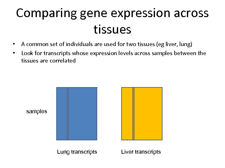 Comparing gene expression across tissues • A common set of individuals are used for two tissues (eg liver, lung) • Look for transcripts whose expression levels across samples between the tissues are correlated samples Lung transcripts Liver transcripts