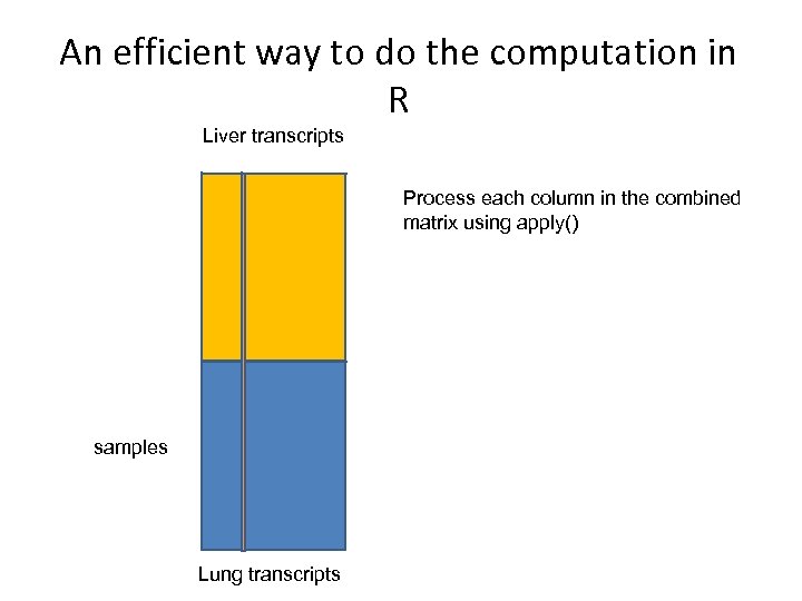 An efficient way to do the computation in R Liver transcripts Process each column in the combined matrix using apply() samples Lung transcripts