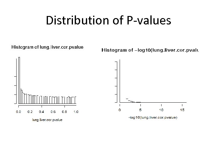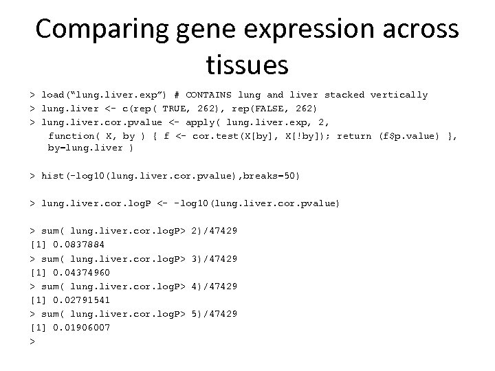 Comparing gene expression across tissues > load(“lung. liver. exp”) # CONTAINS lung and liver stacked vertically > lung. liver <- c(rep( TRUE, 262), rep(FALSE, 262) > lung. liver. cor. pvalue <- apply( lung. liver. exp, 2, function( X, by ) { f <- cor. test(X[by], X[!by]); return (f$p. value) }, by=lung. liver ) > hist(-log 10(lung. liver. cor. pvalue), breaks=50) > lung. liver. cor. log. P <- -log 10(lung. liver. cor. pvalue) > sum( lung. liver. cor. log. P> [1] 0. 0837884 > sum( lung. liver. cor. log. P> [1] 0. 04374960 > sum( lung. liver. cor. log. P> [1] 0. 02791541 > sum( lung. liver. cor. log. P> [1] 0. 01906007 > 2)/47429 3)/47429 4)/47429 5)/47429