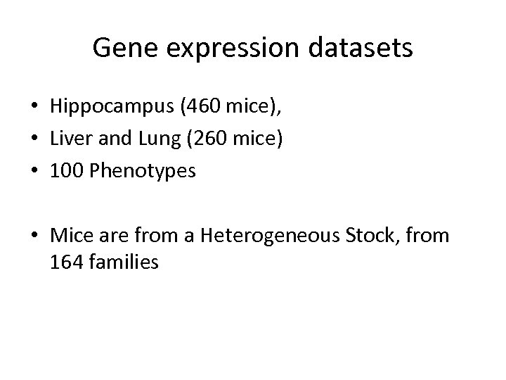 Gene expression datasets • Hippocampus (460 mice), • Liver and Lung (260 mice) • 100 Phenotypes • Mice are from a Heterogeneous Stock, from 164 families