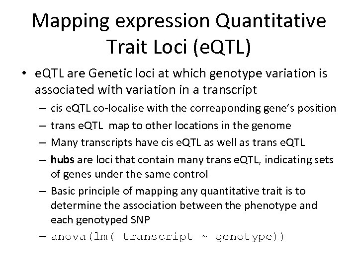 Mapping expression Quantitative Trait Loci (e. QTL) • e. QTL are Genetic loci at which genotype variation is associated with variation in a transcript cis e. QTL co-localise with the correaponding gene’s position trans e. QTL map to other locations in the genome Many transcripts have cis e. QTL as well as trans e. QTL hubs are loci that contain many trans e. QTL, indicating sets of genes under the same control – Basic principle of mapping any quantitative trait is to determine the association between the phenotype and each genotyped SNP – anova(lm( transcript ~ genotype)) – –