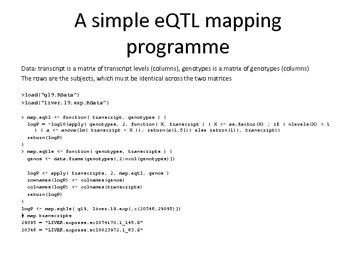 A simple e. QTL mapping programme Data: transcript is a matrix of transcript levels (columns), genotypes is a matrix of genotypes (columns) The rows are the subjects, which must be identical across the two matrices >load(“g 19. RData”) >load(“liver. 19. exp. RData”) > map. eqtl <- function( transcript, genotypes ) { log. P = -log 10(apply( genotypes, 2, function( X, transcript ) { X <- as. factor(X) ; if ( nlevels(X) > 1 ) { a <- anova(lm( transcript ~ X )); return(a[1, 5])} else return(1)}, transcript)) return(log. P) } > map. eqtls <- function( genotypes, transcripts ) { genos <- data. frame(genotypes[, 2: ncol(genotypes)]) log. P <- apply( transcripts, 2, map. eqtl, genos ) rownames(log. P) <- colnames(genos) colnames(log. P) <- colnames(transcripts) return(log. P) } log. P <- map. eqtls( g 19, liver. 19. exp[, c(20346, 29095)]) # map transcripts 29095 = "LIVER. express. scl 074170. 1_145. S" 20346 = "LIVER. express. scl 0023972. 1_63. S"