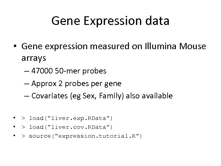 Gene Expression data • Gene expression measured on Illumina Mouse arrays – 47000 50 -mer probes – Approx 2 probes per gene – Covariates (eg Sex, Family) also available • > load("liver. exp. RData") • > load("liver. cov. RData") • > source("expression. tutorial. R")