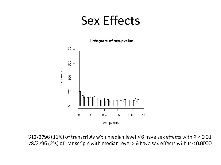 Sex Effects 312/2796 (11%) of transcripts with median level > 6 have sex effects with P < 0. 01 78/2796 (2%) of transcripts with median level > 6 have sex effects with P < 0. 00001