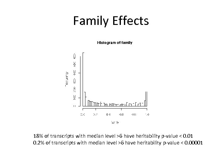 Family Effects 18% of transcripts with median level >6 have heritability p-value < 0. 01 0. 2% of transcripts with median level >6 have heritability p-value < 0. 00001