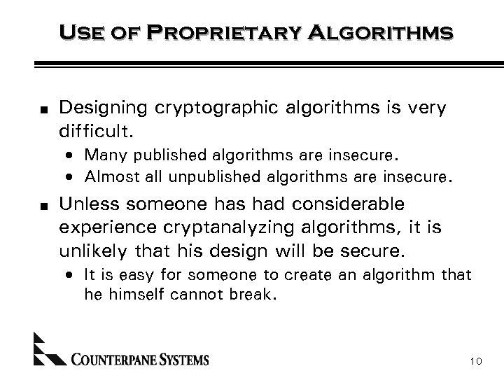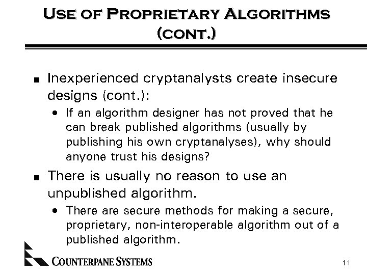Use of Proprietary Algorithms n Designing cryptographic algorithms is very difficult. · Many published algorithms are insecure. · Almost all unpublished algorithms are insecure. n Unless someone has had considerable experience cryptanalyzing algorithms, it is unlikely that his design will be secure. · It is easy for someone to create an algorithm that he himself cannot break. 10
