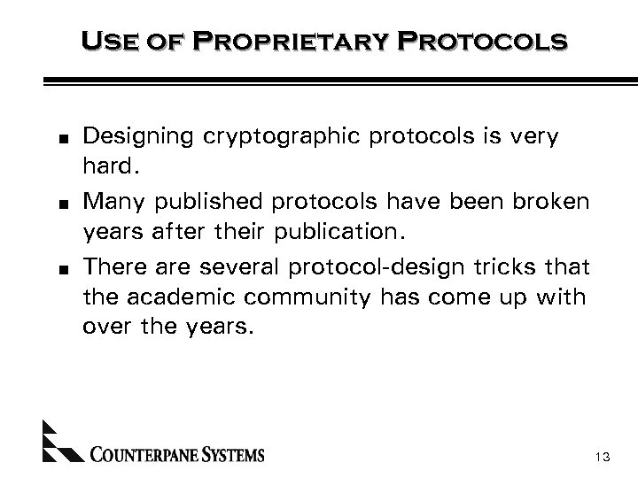Use of Proprietary Algorithms (cont. ) n n n There is usually no reason to use a new and unanalyzed algorithm in place of an older and better analyzed one. There is no substitute for peer review. Never, trust a proprietary or secret algorithm. (The NSA is the exception to this rule. ) 12