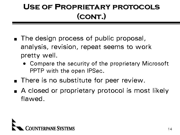 Use of Proprietary Protocols n n n Designing cryptographic protocols is very hard. Many published protocols have been broken years after their publication. There are several protocol-design tricks that the academic community has come up with over the years. 13