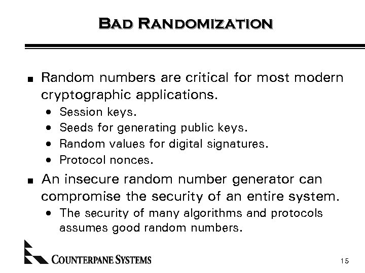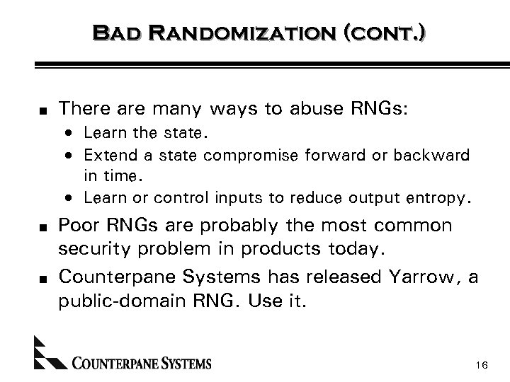 Bad Randomization n Random numbers are critical for most modern cryptographic applications. · · n Session keys. Seeds for generating public keys. Random values for digital signatures. Protocol nonces. An insecure random number generator can compromise the security of an entire system. · The security of many algorithms and protocols assumes good random numbers. 15