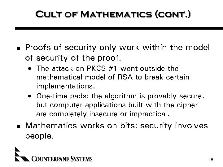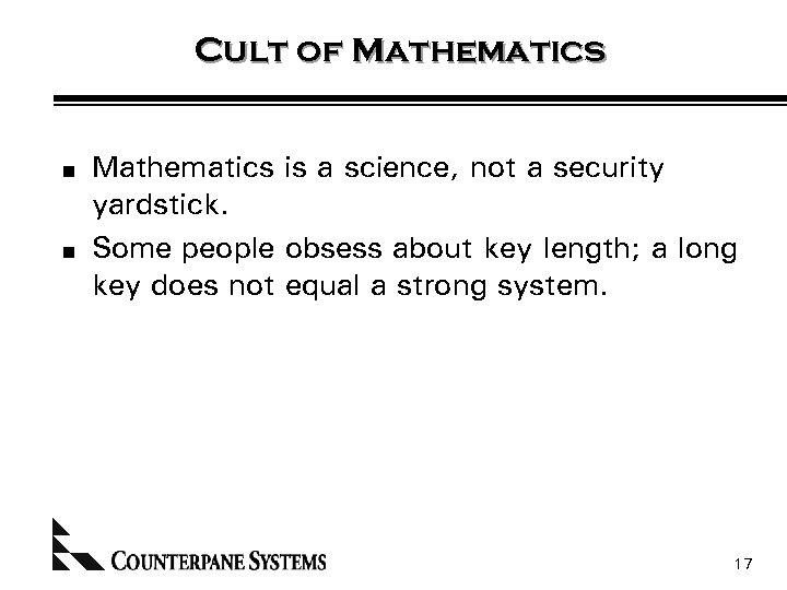 Cult of Mathematics n n Mathematics is a science, not a security yardstick. Some people obsess about key length; a long key does not equal a strong system. 17