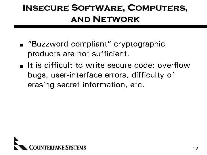 Cult of Mathematics (cont. ) n Proofs of security only work within the model of security of the proof. · The attack on PKCS #1 went outside the mathematical model of RSA to break certain implementations. · One-time pads: the algorithm is provably secure, but computer applications built with the cipher are completely insecure or impractical. n Mathematics works on bits; security involves people. 18