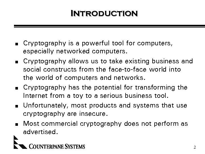Introduction n n Cryptography is a powerful tool for computers, especially networked computers. Cryptography allows us to take existing business and social constructs from the face-to-face world into the world of computers and networks. Cryptography has the potential for transforming the Internet from a toy to a serious business tool. Unfortunately, most products and systems that use cryptography are insecure. Most commercial cryptography does not perform as advertised. 2
