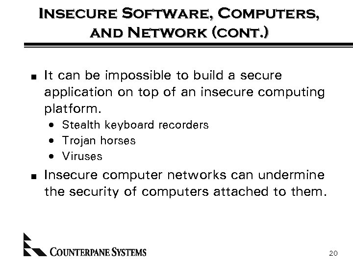 Insecure Software, Computers, and Network (cont. ) n It can be impossible to build a secure application on top of an insecure computing platform. · Stealth keyboard recorders · Trojan horses · Viruses n Insecure computer networks can undermine the security of computers attached to them. 20