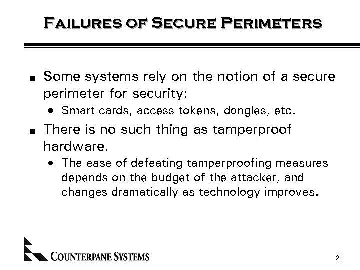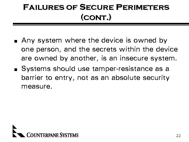 Failures of Secure Perimeters n Some systems rely on the notion of a secure perimeter for security: · Smart cards, access tokens, dongles, etc. n There is no such thing as tamperproof hardware. · The ease of defeating tamperproofing measures depends on the budget of the attacker, and changes dramatically as technology improves. 21