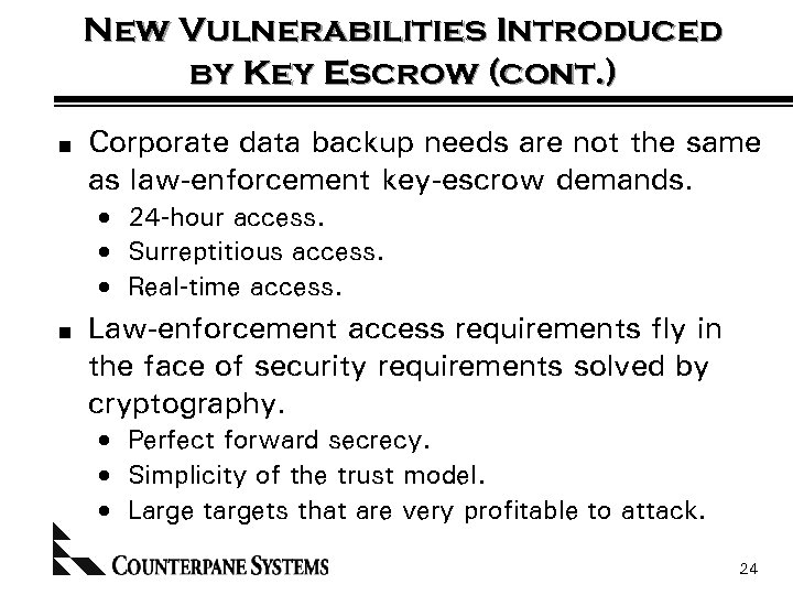 New Vulnerabilities Introduced by Key Escrow (cont. ) n Corporate data backup needs are not the same as law-enforcement key-escrow demands. · 24 -hour access. · Surreptitious access. · Real-time access. n Law-enforcement access requirements fly in the face of security requirements solved by cryptography. · Perfect forward secrecy. · Simplicity of the trust model. · Large targets that are very profitable to attack. 24