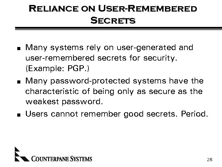 Reliance on User-Remembered Secrets n n n Many systems rely on user-generated and user-remembered secrets for security. (Example: PGP. ) Many password-protected systems have the characteristic of being only as secure as the weakest password. Users cannot remember good secrets. Period. 26