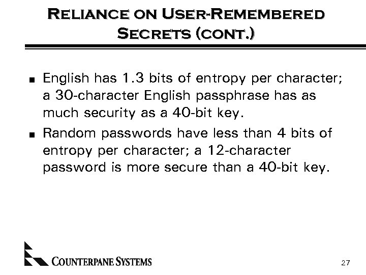 Reliance on User-Remembered Secrets (cont. ) n n English has 1. 3 bits of entropy per character; a 30 -character English passphrase has as much security as a 40 -bit key. Random passwords have less than 4 bits of entropy per character; a 12 -character password is more secure than a 40 -bit key. 27