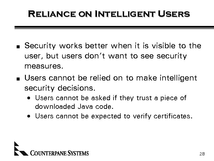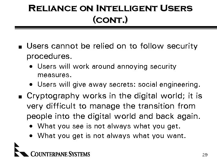 Reliance on Intelligent Users n n Security works better when it is visible to the user, but users don’t want to see security measures. Users cannot be relied on to make intelligent security decisions. · Users cannot be asked if they trust a piece of downloaded Java code. · Users cannot be expected to verify certificates. 28