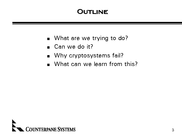 Outline n n What are we trying to do? Can we do it? Why cryptosystems fail? What can we learn from this? 3