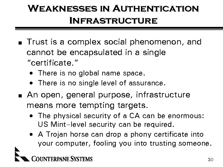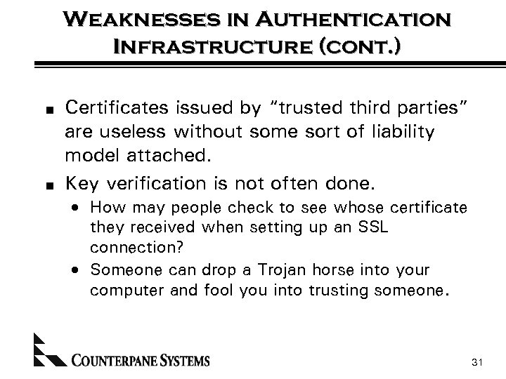 Weaknesses in Authentication Infrastructure n Trust is a complex social phenomenon, and cannot be encapsulated in a single “certificate. ” · There is no global name space. · There is no single level of assurance. n An open, general purpose, infrastructure means more tempting targets. · The physical security of a CA can be enormous: US Mint–level security can be required. · A Trojan horse can drop a phony certificate into your computer, fooling you into trusting someone. 30