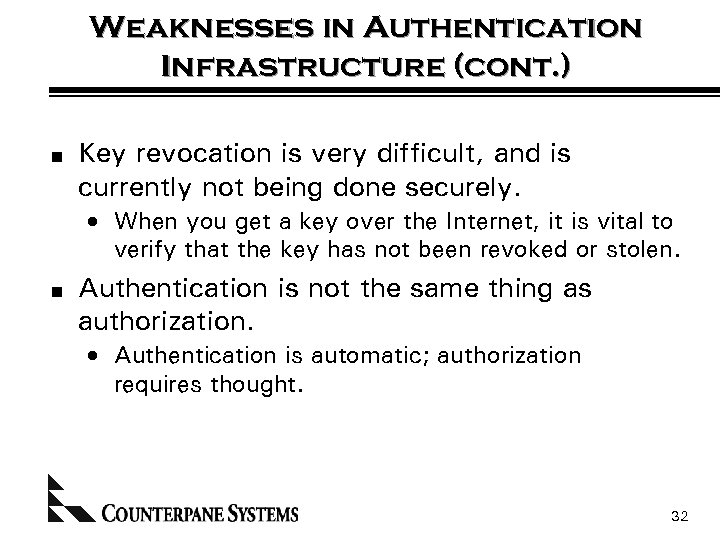 Weaknesses in Authentication Infrastructure (cont. ) n n Certificates issued by “trusted third parties” are useless without some sort of liability model attached. Key verification is not often done. · How may people check to see whose certificate they received when setting up an SSL connection? · Someone can drop a Trojan horse into your computer and fool you into trusting someone. 31
