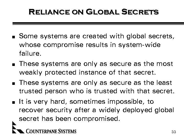 Reliance on Global Secrets n n Some systems are created with global secrets, whose compromise results in system-wide failure. These systems are only as secure as the most weakly protected instance of that secret. These systems are only as secure as the least trusted person who is trusted with that secret. It is very hard, sometimes impossible, to recover security after a widely deployed global secret has been compromised. 33