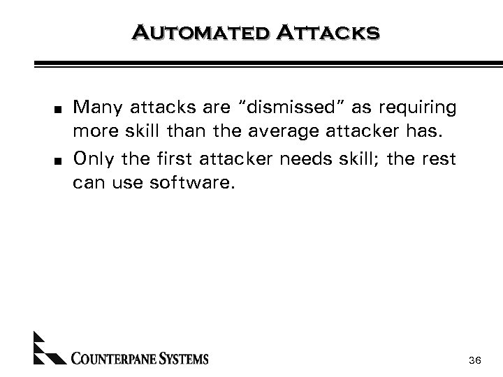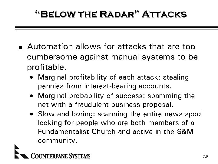 “Below the Radar” Attacks n Automation allows for attacks that are too cumbersome against manual systems to be profitable. · Marginal profitability of each attack: stealing pennies from interest-bearing accounts. · Marginal probability of success: spamming the net with a fraudulent business proposal. · Slow and boring: scanning the entire news spool looking for people who are both members of a Fundamentalist Church and active in the S&M community. 35