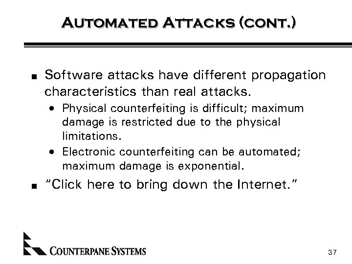 Automated Attacks (cont. ) n Software attacks have different propagation characteristics than real attacks. · Physical counterfeiting is difficult; maximum damage is restricted due to the physical limitations. · Electronic counterfeiting can be automated; maximum damage is exponential. n “Click here to bring down the Internet. ” 37
