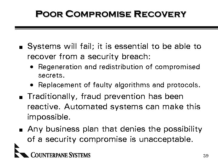 Poor Compromise Recovery n Systems will fail; it is essential to be able to recover from a security breach: · Regeneration and redistribution of compromised secrets. · Replacement of faulty algorithms and protocols. n n Traditionally, fraud prevention has been reactive. Automated systems can make this impossible. Any business plan that denies the possibility of a security compromise is unacceptable. 39