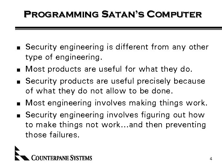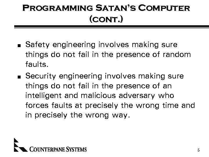 Programming Satan’s Computer n n n Security engineering is different from any other type of engineering. Most products are useful for what they do. Security products are useful precisely because of what they do not allow to be done. Most engineering involves making things work. Security engineering involves figuring out how to make things not work…and then preventing those failures. 4