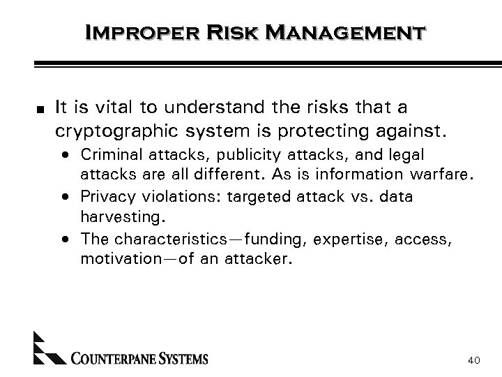 Improper Risk Management n It is vital to understand the risks that a cryptographic system is protecting against. · Criminal attacks, publicity attacks, and legal attacks are all different. As is information warfare. · Privacy violations: targeted attack vs. data harvesting. · The characteristics—funding, expertise, access, motivation—of an attacker. 40